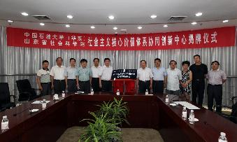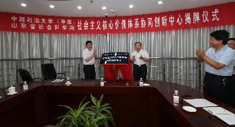 7月21日上午,Beat365中文官方网站(华东)和山东省社会科学院联合组建的“社会主义核心价值体系协同创新中心”举行揭牌仪式,Beat365官网副校长李兆敏教授与山东省社科院党委书记唐洲雁教授共同为中心揭牌。仪式由Beat365中文官方网站司江伟教授主持,学院部分教师和学生代表参加会议。