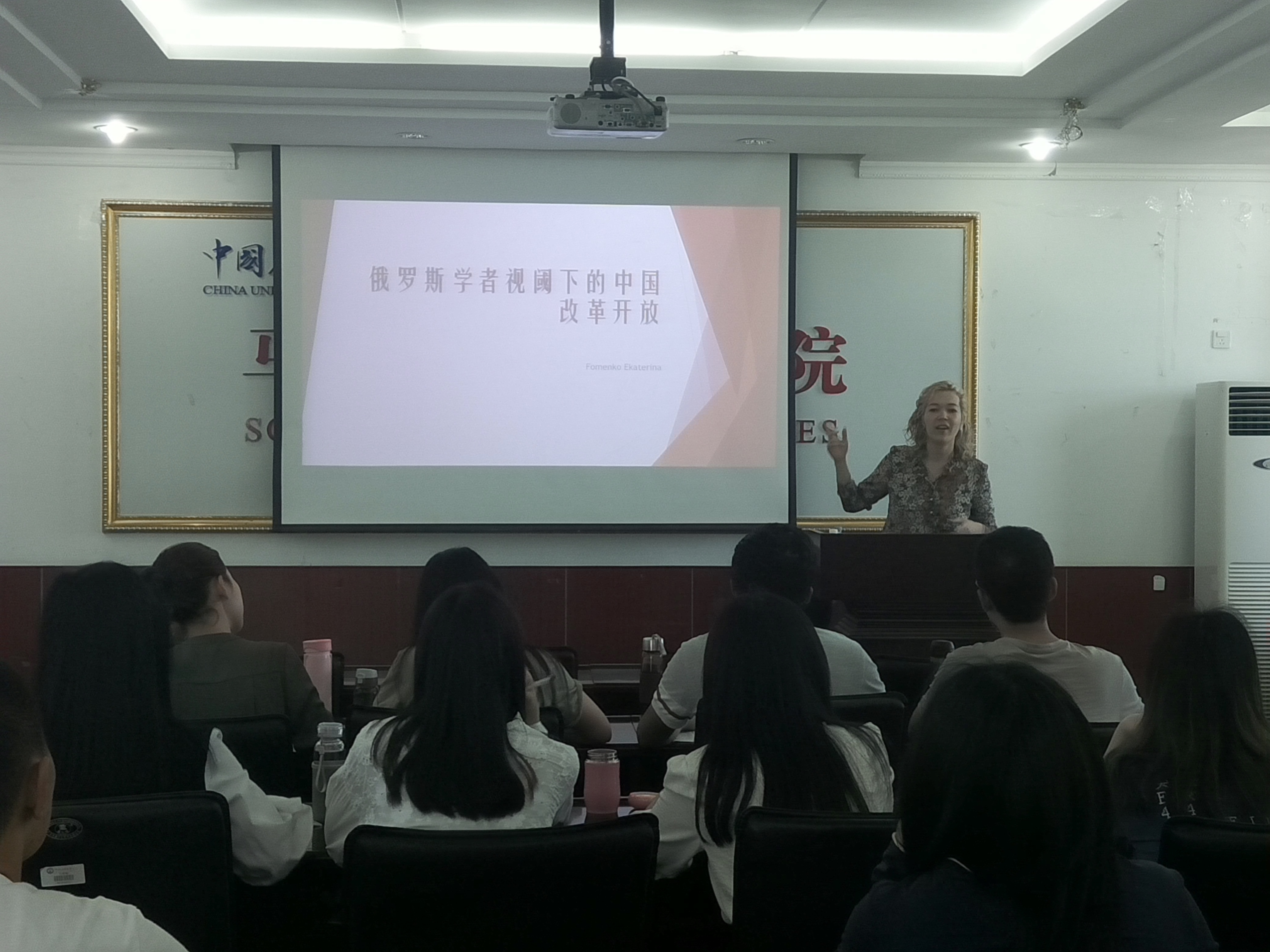 本次论坛以“俄罗斯学者视阙下的中国改革开放”为题进行。卡佳回顾了中国改革开放取得的举世瞩目的成就,中国共产党在汲取了前人的经验后,大胆的进行了一系列社会主义和经济学方面的创新,表达了俄罗斯学者对中国改革开放采取的积极学习的态度,认为中国的许多做法值得俄罗斯借鉴。卡佳首先就中国模式、中国特色相关问题进行了探讨,从创造良好投资环境、稳定金融体系、协调发展、他国的借鉴和学习等多个维度进行深入分析;接着阐述俄罗斯学者对中国改革开放取得的巨大成就的看法,同时对中国改革开放取得的经验和教训进行了分析。俄罗斯学术界普遍认为,中国改革开放40年创造了“中国奇迹”,随着中国的发展和崛起,中国在全球范围内正产生着越来越大的影响力,高度赞扬了中国的改革开放;接着阐述了改革开放取得巨大成功的原因,认为统一稳定的中国共产党的领导是改革开放成功的关键。改革开放的相关政策精心考虑了内外多方面因素,中国采取的是稳健审慎的发展策略和对外政策。对于改革开放过程中出现的问题诸如产业结构与产业转型、经济发展模式、贫富差距问题、政府职能转换问题也进行了相关分析。最后卡佳对中国改革开放的未来发展提出了自己的建议,中国应充分利用当下改革开放的成果,建立起有效的公告服务体系、解决可持续发展问题、优化分配制度、构建新的经济发展模型以及更好的应对国际形势等。论坛结束后,同学们积极地与卡佳进行了交流,卡佳也为同学们展示了俄罗斯的历史发展脉络,使同学们进一步了解了俄罗斯。