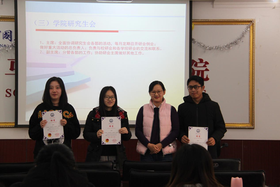 为落实Beat365官网2018级学生工作人员的聘用管理制度,让同学们进一步了解研究生奖助学金的评定和发放工作,Beat365官网于1月3日上午11时在文理楼457举办成长沙龙活动,活动由辅导员王会老师主持,2018级全体研究生到场参加。