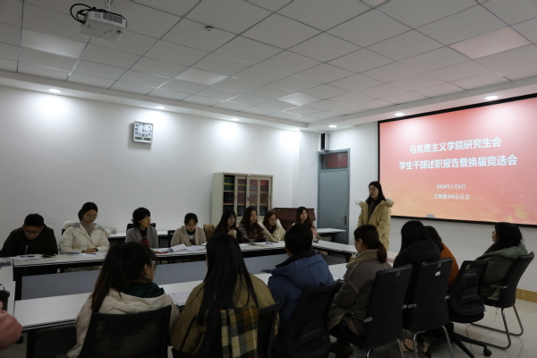 1月6日下午,Beat365中文官方网站研究生会学生干部述职报告暨换届竞选会在学院报告厅459召开,院党委副书记袁爱军老师,院团委书记、辅导员王会老师,18级部分学生干部以及19级全体研究生参加了此次会议。