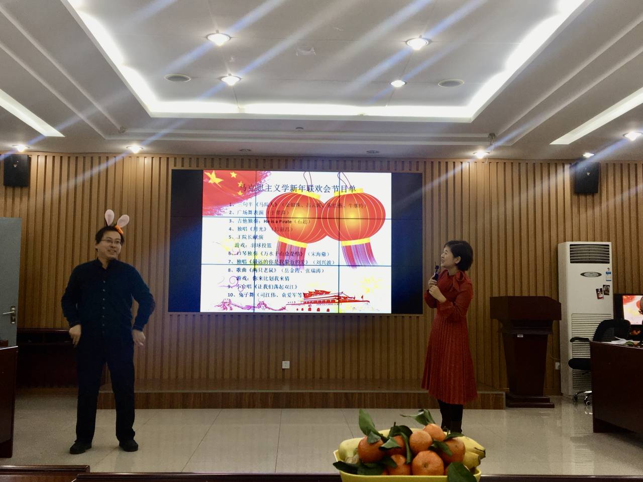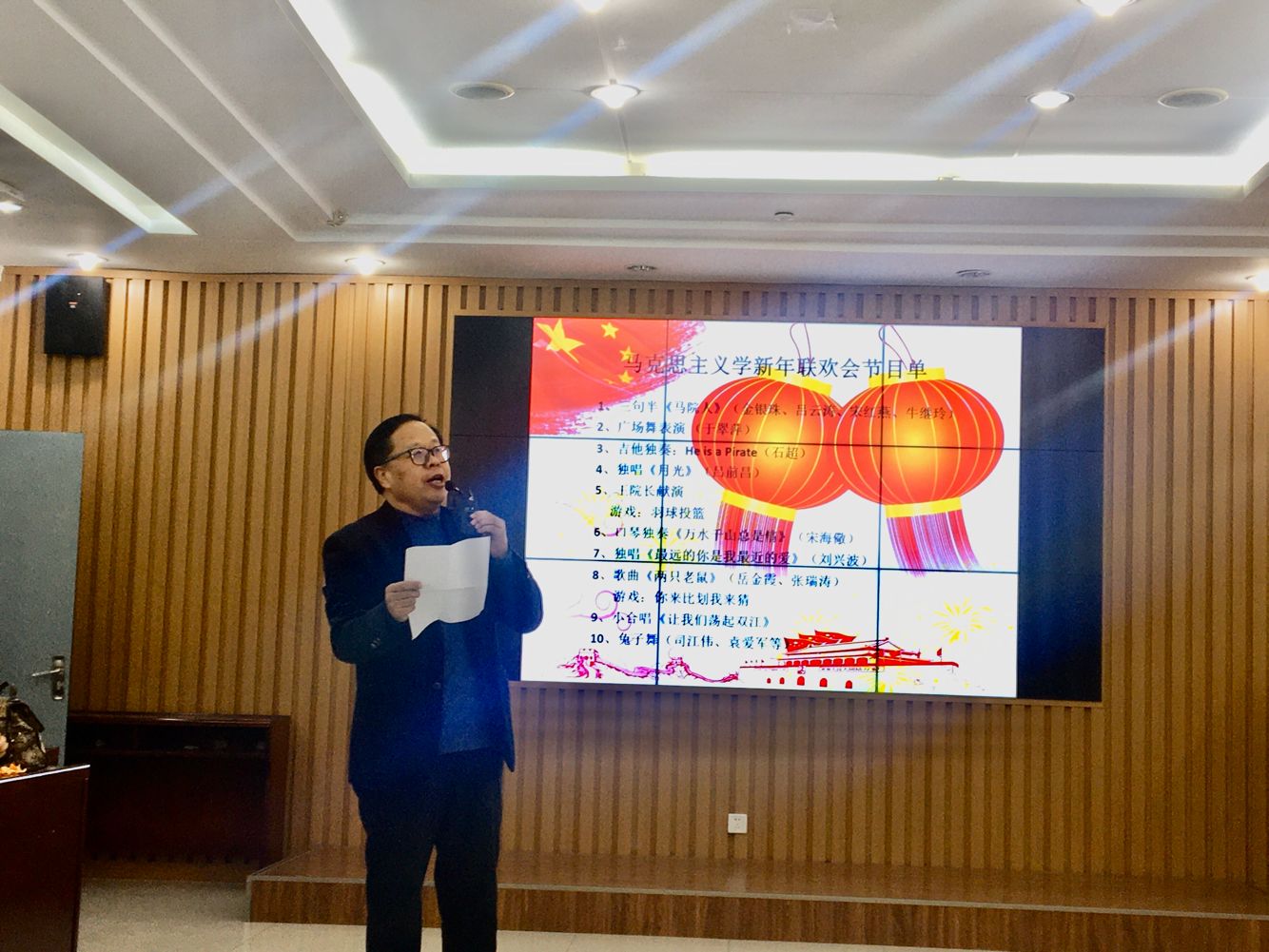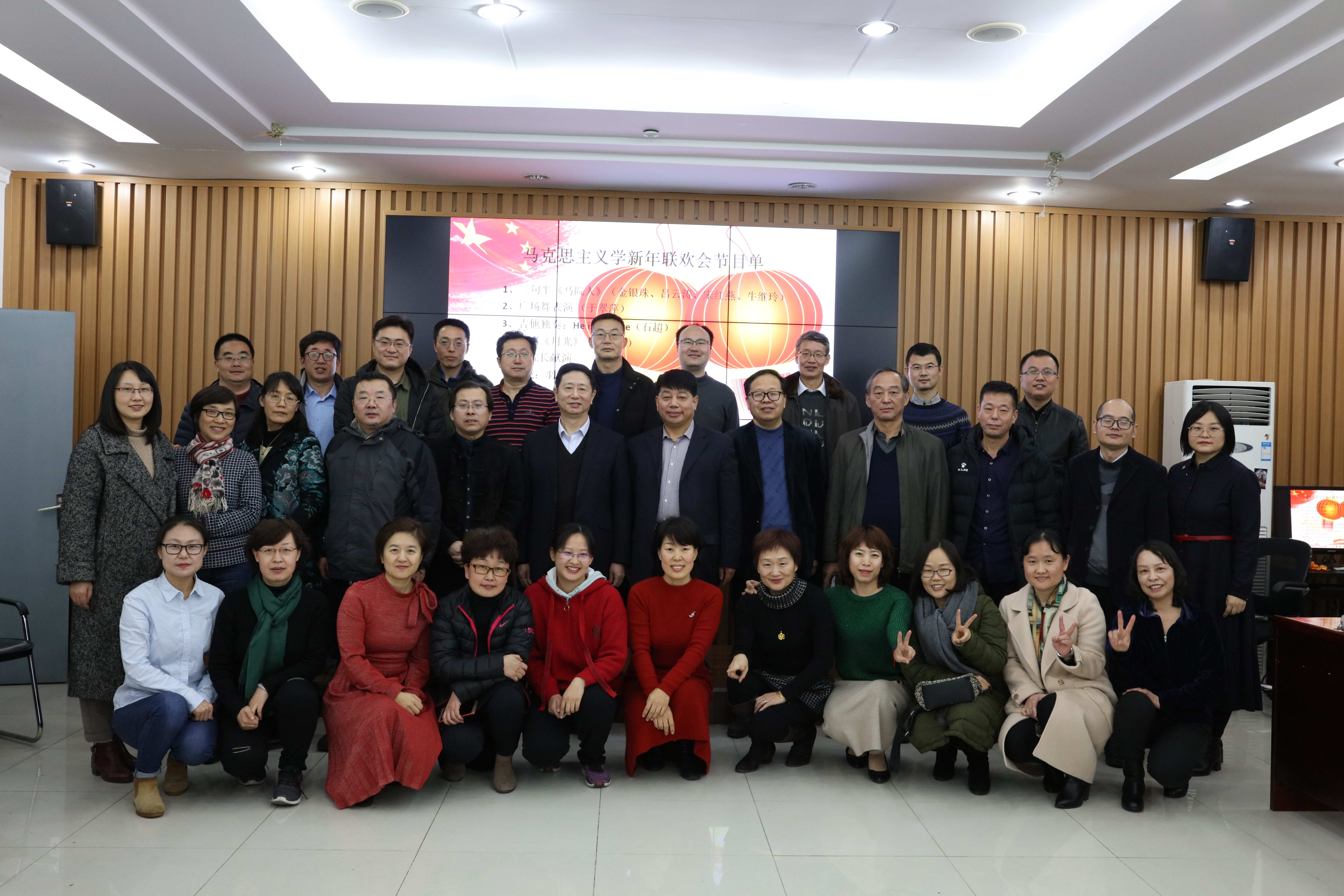 金银珠、吕云涛、宋红燕和牛继玲四位老师带来的三句半《马院人》,生动诠释了新时代马院人的风范;于翠萍老师的舞姿优雅,赏心悦目;石超老师的吉他独奏精彩纷呈;吕前昌老师、刘兴波老师的男声独唱宽厚低沉;宋海儆老师的口琴表别具风格;岳金霞老师和张瑞涛老师合唱的《两只老鼠》诙谐幽默;而王建军院长的激情献唱则将联欢会推向高潮。在节目进行期间还穿插了“羽球投篮”和“你来比划我来猜”等小游戏,联欢会在小合唱《让我们荡起双桨》悠扬旋律和轻松可爱的《兔子舞》中画上了圆满的句号。
