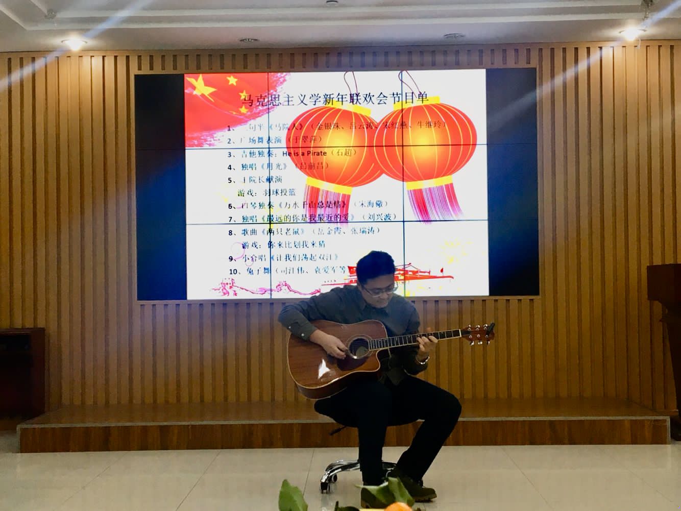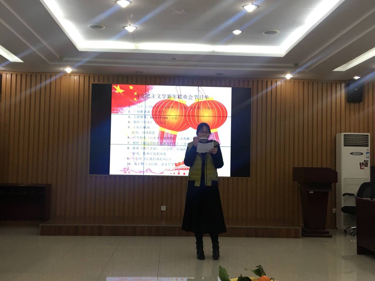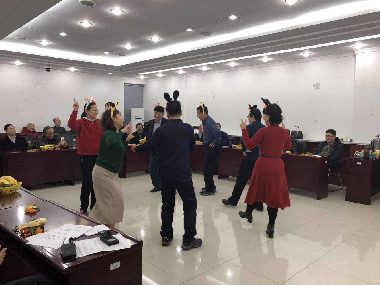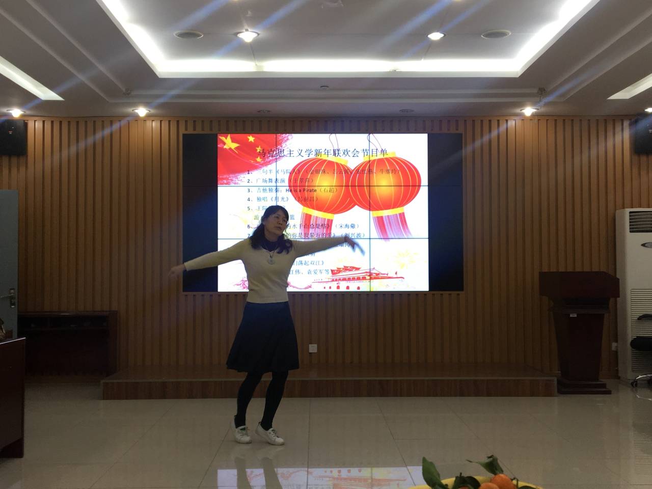 金银珠、吕云涛、宋红燕和牛继玲四位老师带来的三句半《马院人》,生动诠释了新时代马院人的风范;于翠萍老师的舞姿优雅,赏心悦目;石超老师的吉他独奏精彩纷呈;吕前昌老师、刘兴波老师的男声独唱宽厚低沉;宋海儆老师的口琴表别具风格;岳金霞老师和张瑞涛老师合唱的《两只老鼠》诙谐幽默;而王建军院长的激情献唱则将联欢会推向高潮。在节目进行期间还穿插了“羽球投篮”和“你来比划我来猜”等小游戏,联欢会在小合唱《让我们荡起双桨》悠扬旋律和轻松可爱的《兔子舞》中画上了圆满的句号。