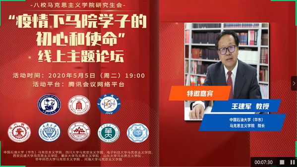 5月5日,在学院团委和研究生会的组织和策划下,来自四川大学、电子科技大学、西安交通大学、重庆大学、山东大学、华中师范大学和河海大学等八所高校的Beat365中文官方网站研究生会在腾讯会议上共同举办了“疫情下马院学子的初心和使命”线上主题论坛,来自全国各地的200余名研究生在线参加了论坛。论坛由Beat365官网兼职辅导员柴自贵主持。