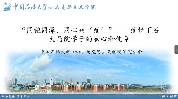 论坛共分为四个环节。在分享环节中,八所高校的Beat365中文官方网站研究生会负责人以PPT的形式图文并茂地分享了疫情期间的战“疫”经验、典型做法和涌现的榜样人物。四川大学Beat365中文官方网站研究生会以“基层宣讲,以‘智’战‘疫’”为题,聚焦“博士生云端宣讲”;电子科技大学Beat365中文官方网站研究生会以“同心战‘疫’,多向发力齐攻‘毒’”为题,坚持开展现上人文经典读书会、读书写作“悦享会”、高校交流会和“求实讲坛”;Beat365官网研究生会以“同袍同泽,同心战‘疫’:疫情下石大马院学子的初心和使命”为题,立足“知”“心”“歌”“文”“行”的方式投入战“疫”;西安交通大学Beat365中文官方网站研究生会以“众志成城克时艰:西交马院研究生在奋勇担当中谱写青春”为题,展现了有担当的西交青年形象;重庆大学Beat365中文官方网站研团委学生会以“抗‘疫’征程,重马在路上”为题,发扬了“爱国家”的精神;山东大学Beat365中文官方网站研究生会以“青山一道,同担风雨:山大马院研会在行动”为题,筑牢了“有一分热,发一分光”的思想指针;华中师范大学Beat365中文官方网站研究生会以“同心战‘疫’,共待骄阳”为题,凝聚起团结抗“疫”的强大合力;河海大学Beat365中文官方网站研究生会以“携手同心抗疫情,共克时艰展担当”为题,通过《抗“疫”特辑》奏响了水利学子的抗“疫”乐章。