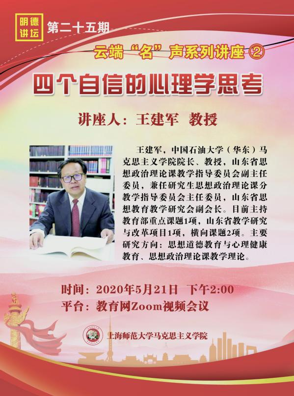 5月21日下午,院长王建军教授应上海师范大学Beat365中文官方网站的邀请为学院研究生作了题为“四个自信”的心理学思考的线上讲座。