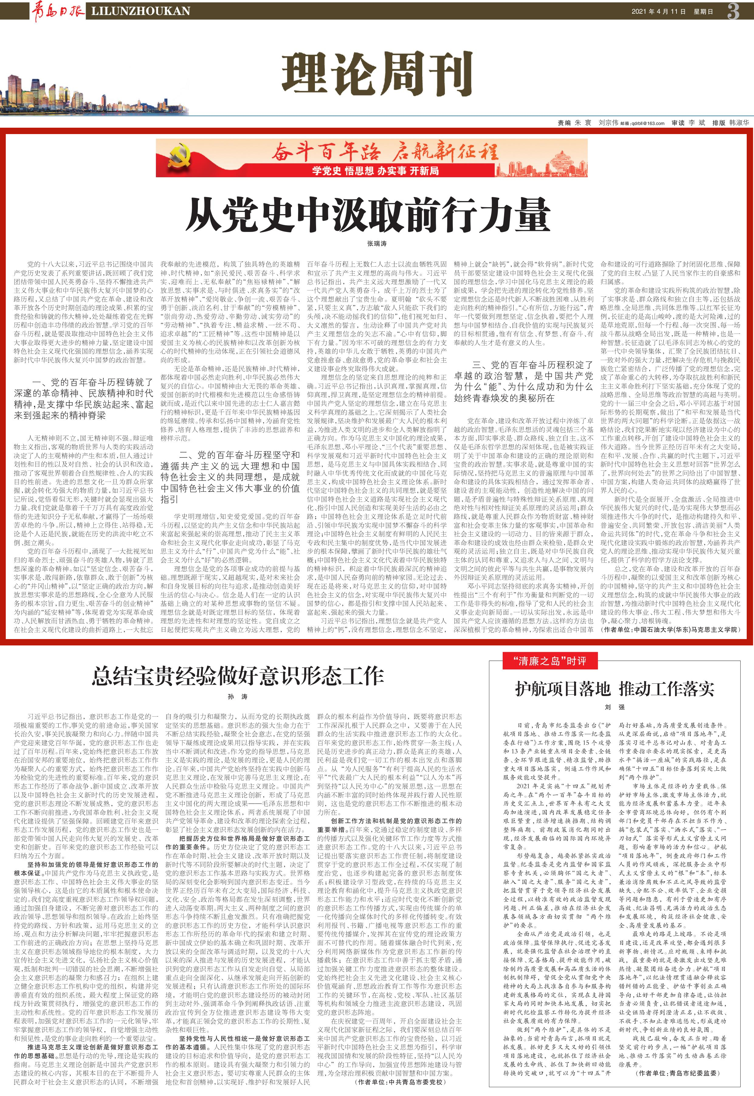 2021年4月11日,《青岛日报》第3版(理论版)刊发Beat365官网张瑞涛教授理论文章《从党史中汲取前行力量》。