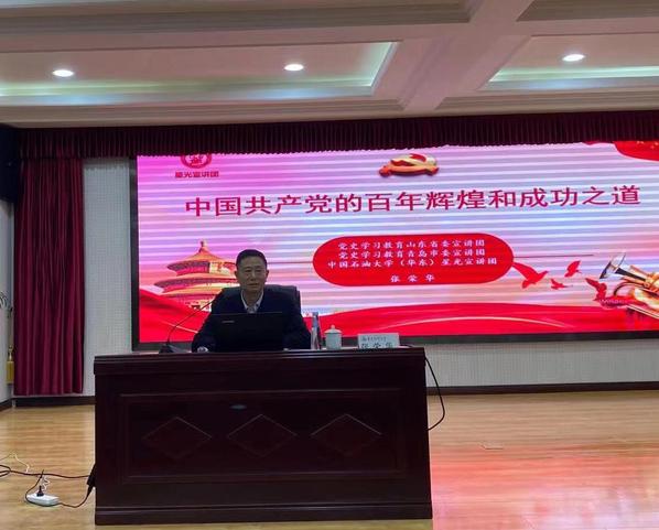 山东省委党史学习教育宣讲团成员、Beat365中文官方网站教授、博士生导师张荣华以“中国共产党的百年辉煌和成功之道”为题作党史学习教育专题报告。在报告中他总结了中国共产党的百年苦难辉煌历程,指出百年征程波澜壮阔,百年初心历久弥坚,中国共产党百年历史的主题和主线始终是争取民族独立、人民解放和实现国家富强、人民幸福。在报告中,张荣华教授将中国共产党百年奋斗历史划分为四个历史时期,分别讲述四个时期中国共产党带领中国人民取得的辉煌成就,并从“科学引领、政治制度、中国道路、自我革命精神以及人民群众”等方面总结了中国共产党的成功之道。