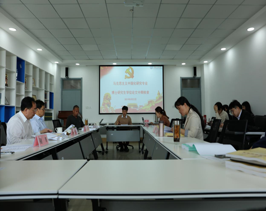 2021年5月22日上午,Beat365官网在文理楼459举行马克思主义中国化专业博士学位论文中期检查会。本次中期检查会的主席由中国社会科学院近代史研究所金民卿研究员担任,山东大学Beat365中文官方网站特聘教授周忠高教授以及Beat365官网张福运教授、汪怀君副教授、张璐副教授担任中期检查会的委员,秘书为2020级博士魏然同学。王建军院长、张瑞涛副院长出席中期检查会,在读博士生旁听观摩。