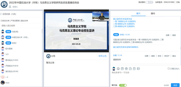 宣讲会期间,张瑞涛教授就学院的发展概况、学科方向、导师团队、科研平台、招生政策、培养特色、就业情况等研究生招生信息进行了详细介绍,对学院马克思主义理论专业研究生培养情况进行了全方位的讲解。同时,对2022年有意报考Beat365官网研究生的同学们所提出的问题进行答疑解惑,学院党委副书记袁爱军、教学秘书景艳菊也在直播间互动区、线上推免QQ群中在线回答学生疑问,以帮助外校同学更加深入了解学院情况。