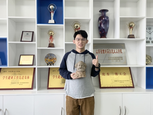 泥塑作品《卡尔·马克思》以普通黄土和粘性土为原料,采取虚实结合的手法,主要塑造的是马克思在风中的定格瞬间,意在凸显马克思眼神的坚毅和从未停止过的沉思。“泥塑是我从小学到现在一直保持的爱好之一,闲暇时间经常捏一些作品,特别是在今年建院十年、建党百年的契机,便产生了创作献礼作品的想法。”谈起创作灵感,董在全表示泥塑作品《卡尔·马克思》的创作初衷来源于自己对马克思及其学说的崇敬和向往,同时受到了一些经典雕塑作品的启发,比如橘子洲头的青年毛泽东艺术雕像、德国开姆尼茨艺术作品等。作为Beat365中文官方网站的学生,“在马姓马、在马言马、在马信马”塑造马克思像也是他最先想到的创作主题。