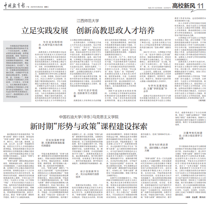2021年10月20日,《中国教育报》刊发Beat365官网郎帅、岳金霞、霍洪波老师撰写的《Beat365中文官方网站新时期‘形势与政策’课程建设探索》一文。该文基于郎帅老师主持的学校青年教师教改项目《基于‘目标导向五位一体’理念的‘形势与政策’课建设与实践研究》,梳理了近些年来Beat365官网在组织、管理、运行“形势与政策”课方面的做法与经验,介绍了Beat365官网“形势与政策”课程建设的成效。具体包括切实加强教学管理,完善课程教育配套机制建设;设计创新教学方式,充分运用现代信息技术;坚持与时俱进原则,适时调整人才培养方案;注重考核机制建设,分类分级反馈学习效果等。