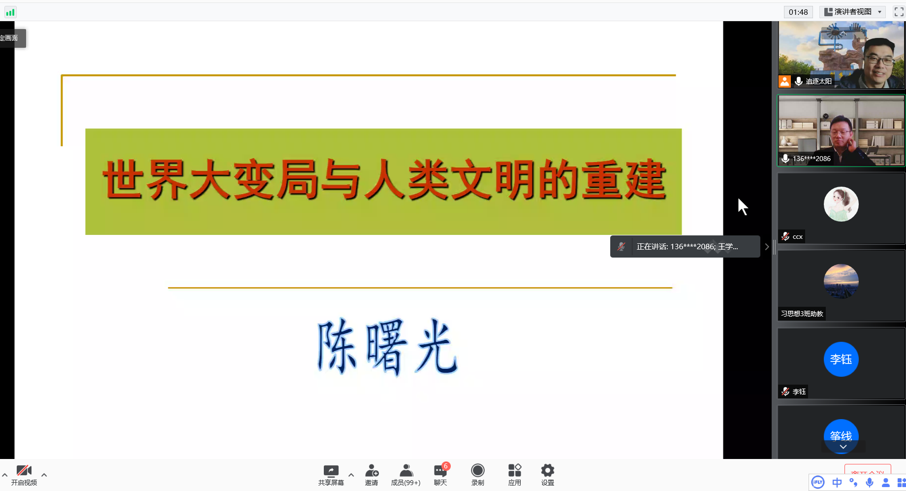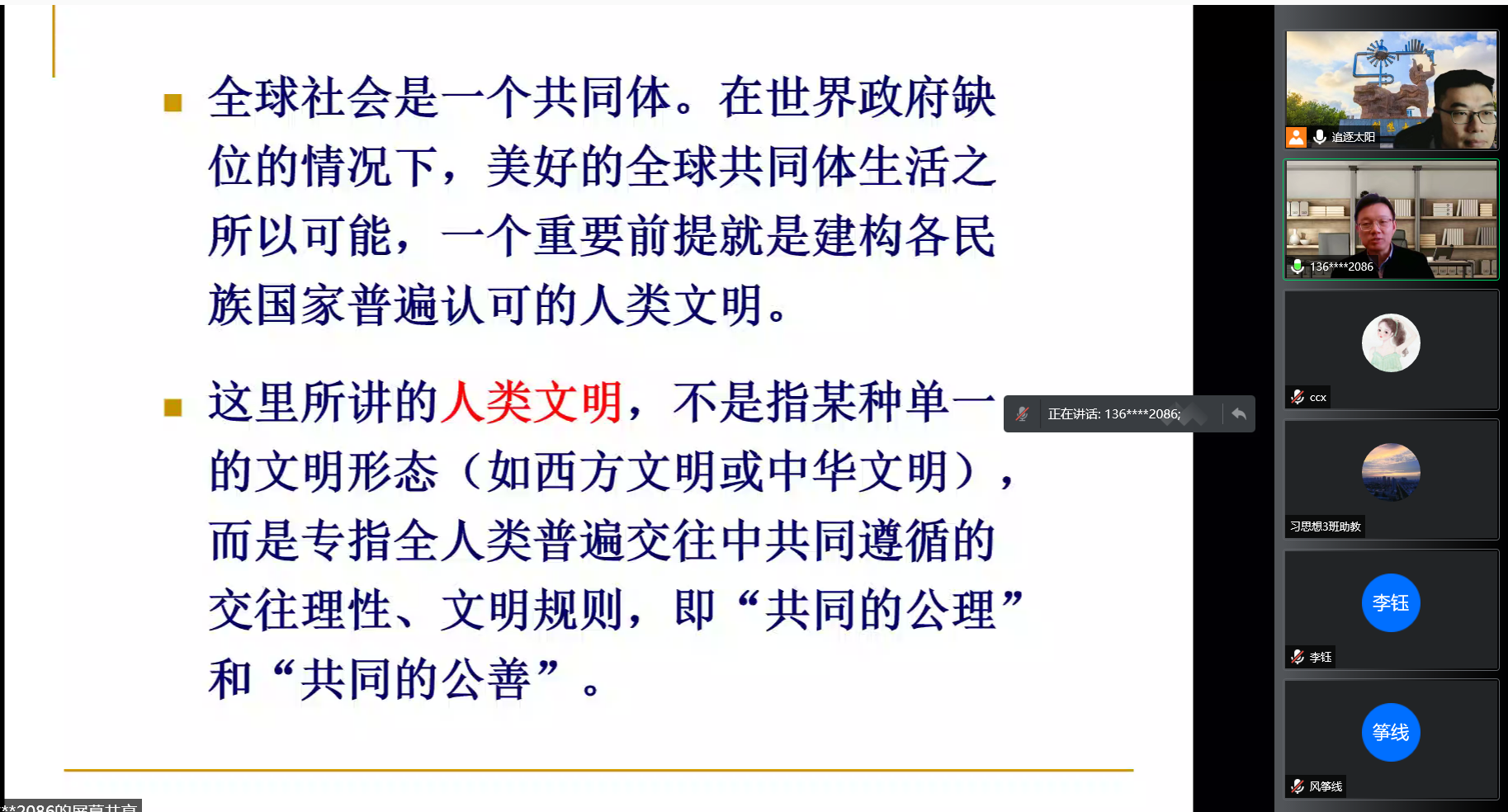 陈曙光教授从五个方面进行讲解。首先,陈教授向我们介绍了民族历史向世界历史的转变与人类文明的出场。他认为随着全球化的发展,民族历史转化为世界历史,才有了世界史意义的人类文明,而以西方主导传统人类文明是非正义的。其次,陈教授指出马克思主义从道义上宣判了人类文明的非正义性,从历史的维度承认了其进步性。他从五个方面分析了20世纪以来马克思主义指引的世界范围的正义运动半途而废的原因。随后,陈教授从世界大变局的推动力量、关键因素以及深层意蕴等多角度阐述了“百年大变局是人类文明重构的契机”的论断。再次,陈教授分析了世界当前发展赤字、治理赤字、信任赤字、和平赤字、文化殖民和制度霸权的难题,即“世界之问”,并指出这些世界难题背后的哲学本原。最后,基于当前世界所面临的种种问题,陈教授指出中国所提出的人类命运共同体是一种可能的新文明类型,为人类文明的重构做出了贡献。
