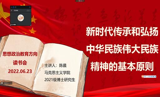 623上午,思想政治教育方向读书会由班主任宋霞老师主持召开。本次读书会依托博士研究生“青蓝”线上学术论坛,围绕2021级博士生陈晨的学术汇报主题《新时代传承和弘扬中华民族伟大民族精神的基本原则》展开交流探讨2021级全体硕士生在线参与讨论。