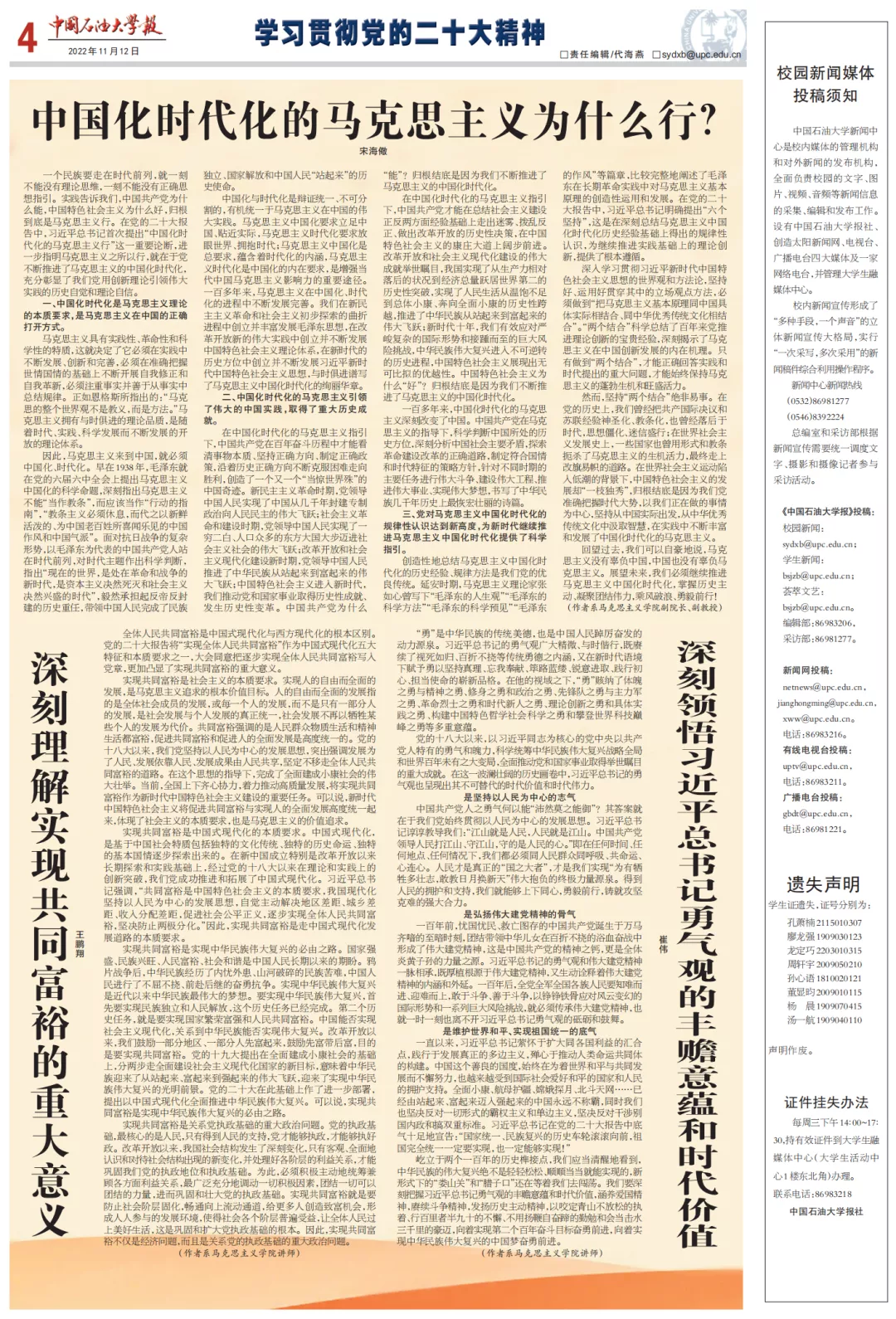 11月12日,《Beat365中文官方网站报》第16期第4版整版刊发了Beat365官网教师撰写的3篇阐释党的二十大精神的理论文章。