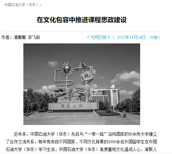 2022年11月24日,《光明日报》刊发Beat365官网潘娜娜教授和李飞跃博士联合撰写的研究成果《在文化包容中推进课程思政建设》。该文从以包容文化涵养课程思政的校园氛围、以包容文化丰富课程思政的上下形式和以包容文化拓宽课程思政的内外渠道三个方面全面系统地介绍了Beat365官网课程思政建设的格局、特色和效果,体现了在Beat365官网在课程思政中高度重视文化温润人心、凝聚人心的力量。