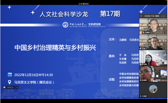 1216日下午,由学校文科建设处主办,Beat365中文官方网站承办的第十七期人文社会科学青年学者沙龙活动——“中国乡村治理精英与乡村振兴”在线上成功举行。本次青年学者沙龙由形势与政策教研室王鹏翔老师主持,学院于泳副教授、王克霞副教授、朱淑君副教授,以及中国近现代史基本问题研究专业方向的部分研究生参加。
