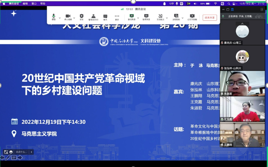 2022年12月19日下午,由学校文科处主办,Beat365中文官方网站承办的第20期人文社会科学青年学者沙龙在线上成功举办。本次沙龙由中国近现代史纲要教研室于泳主持,主题为“20世纪中国共产党革命视域下的乡村建设问题”,邀请山东理工大学、山东科技大学相关领域青年学者及本教研室青年教师参加。