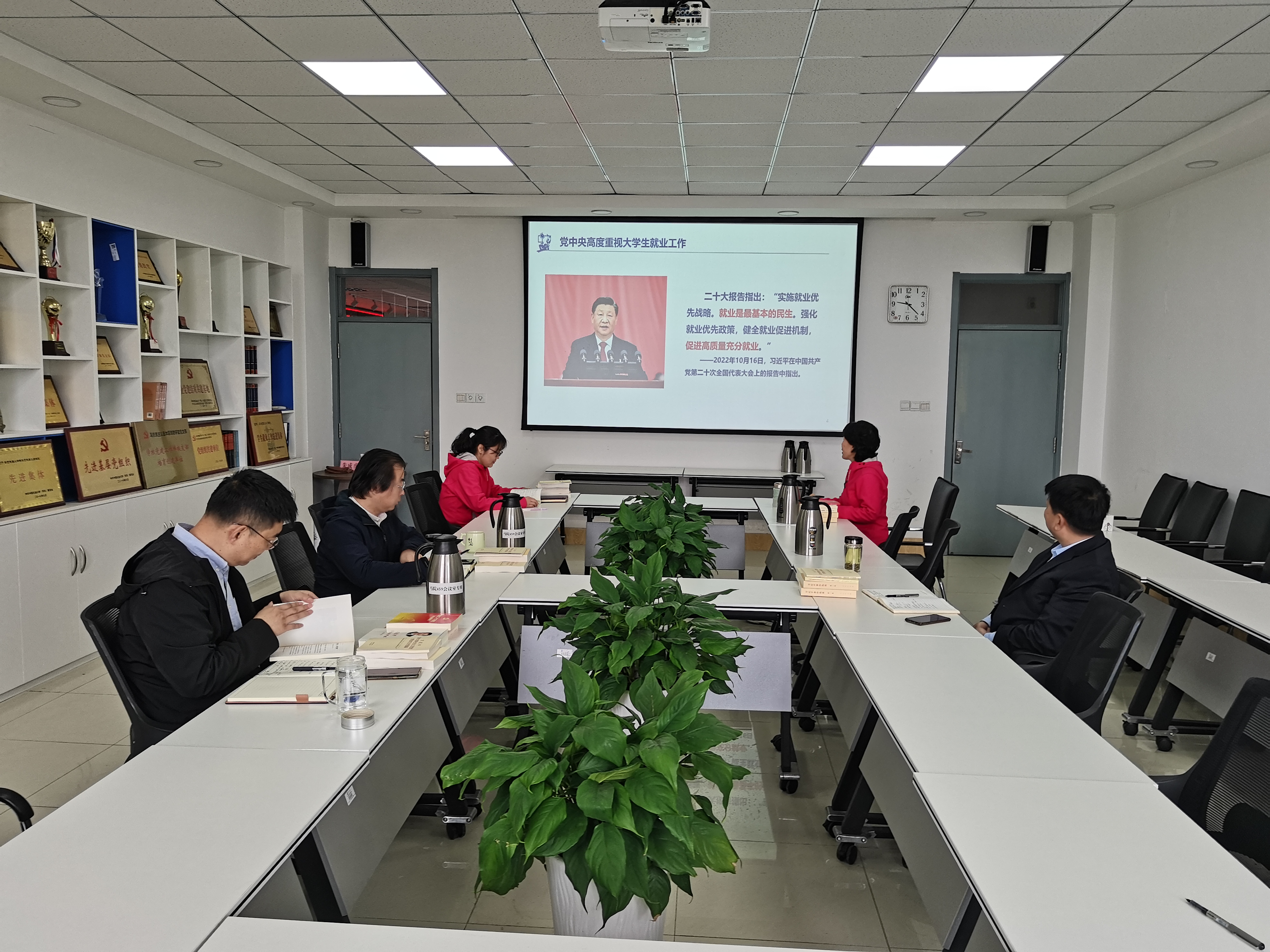 袁爱军以“学习习近平总书记重要论述,促进毕业生高质量充分就业”为题,领学了习近平新时代中国特色社会主义思想中关于教育、民生、就业的相关论述。习近平总书记曾指出,就业是最大的民生工程、民心工程、根基工程,是社会稳定的重要保障,必须抓紧抓实抓好。学习总书记重要讲话精神,一是要按照总书记的指示,把就业工作做好。要落实、落细就业优先政策,把促进毕业生就业工作摆在更加突出的位置,切实保障好基本民生。二是要牢牢把握重要论述背后总书记的为民情怀,体悟总书记对青年大学生、对人民群众的关爱之情。要提升青年学生的高质量就业能力,要带着感情去和青年学生交流,帮助他们解决就业问题。只有用情、用心落实总书记的讲话要求和上级政策,才能真正做到把就业工作落实落细。