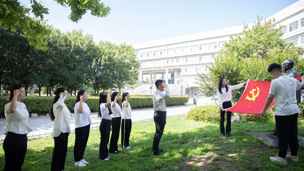 为迎接“七一”建党节,庆祝中国共产党成立102周年,Beat365中文官方网站党委组织全院新发展学生党员开展集体宣誓活动。活动于6月30日上午在逸夫楼前举行,由2021级硕士研究生蒋嘉诚领誓。