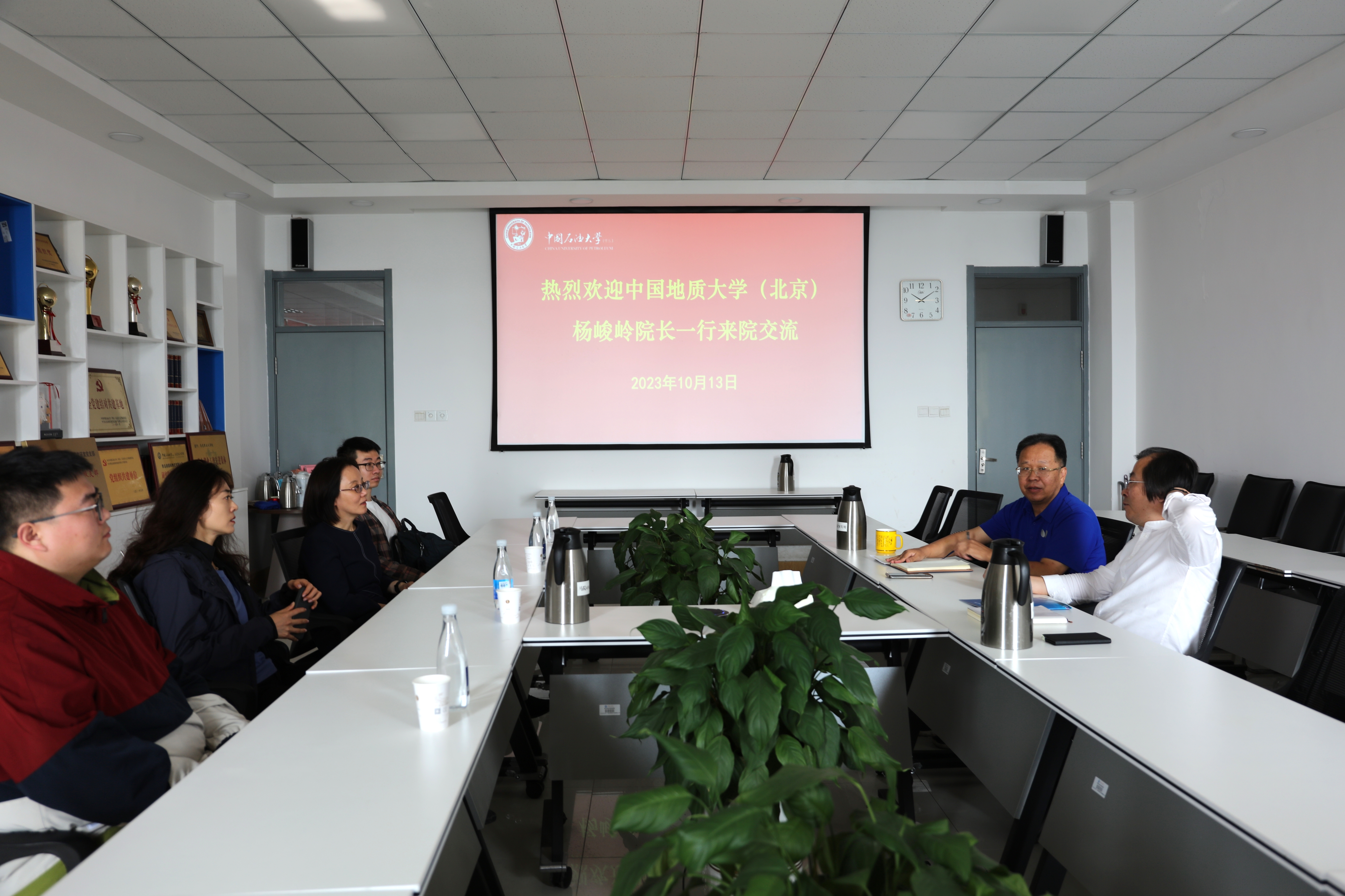 10月13日,中国地质大学(北京)Beat365中文官方网站杨峻岭院长一行来院考察调研,学院院长张瑞涛、教授委员会主席王建军陪同并参加座谈。
