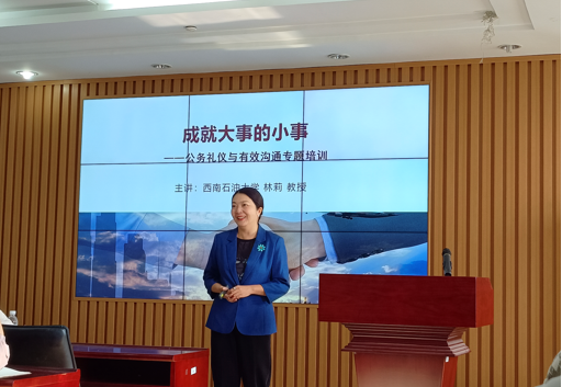 为更好传承中华优秀传统文化,帮助研究生增强沟通能力,培养更具优势的职场能力,10月13日上午,学院在文理楼457顺利举办第三十二期“成长沙龙”活动。本期活动邀请西南石油大学Beat365中文官方网站党委副书记、纪委书记林莉教授进行“公务礼仪与有效沟通”专题讲座,活动由学术部刘圣娟主持,学院党委副书记袁爱军、团委书记王会出席,硕士生、博士生参加。