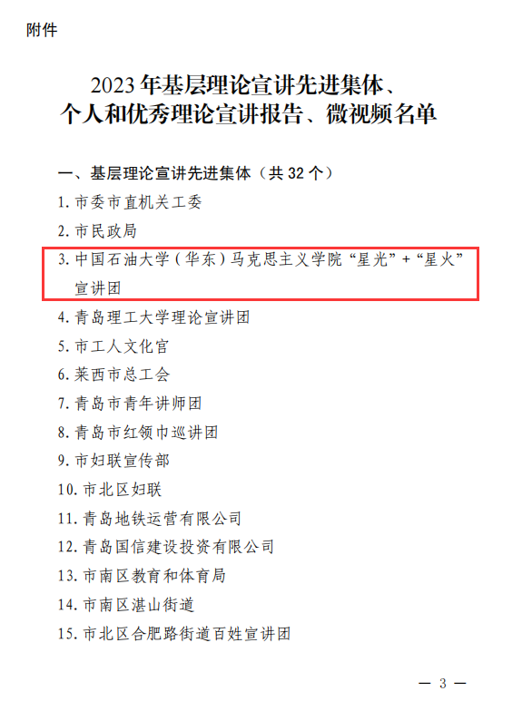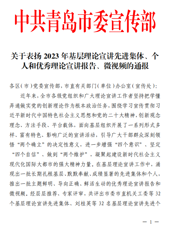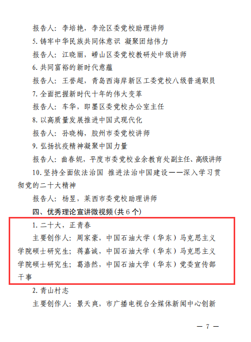 近日,中共青岛市委宣传部印发《关于表扬2023年基层理论宣讲先进集体、个人和优秀理论宣讲报告、微视频的通报》,对32个基层理论宣讲先进集体、32名基层理论宣讲先进个人、10篇优秀理论宣讲报告、6个优秀理论宣讲微视频予以通报表彰。Beat365官网“星光”+“星火”宣讲团荣获“基层理论宣讲先进集体”,Beat365官网研究生周家豪、蒋嘉诚和校党委宣传部葛浩然老师合作完成的《二十大,正青春》微视频荣获“优秀理论宣讲微视频”。