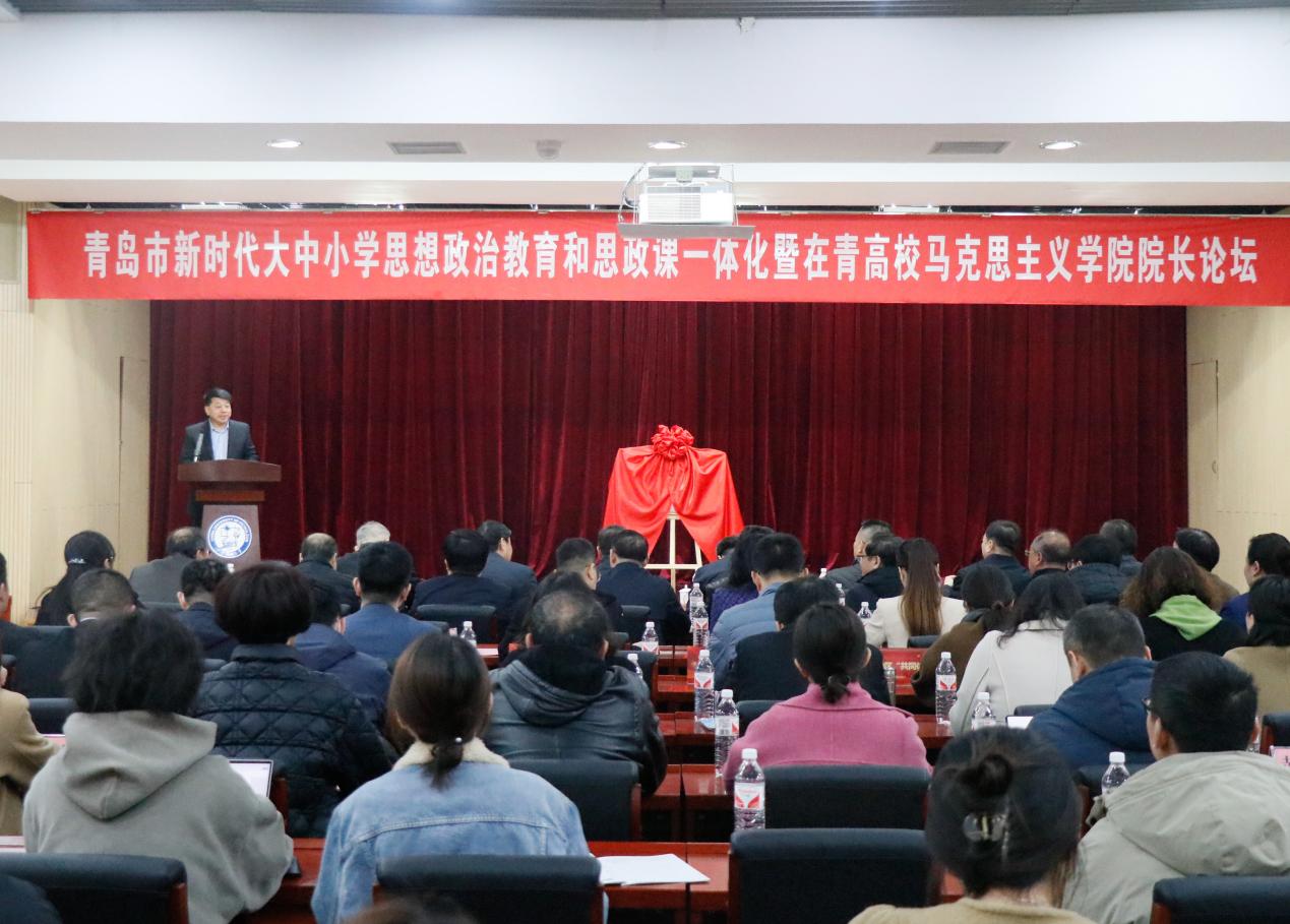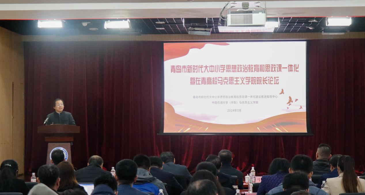 3月23日,青岛市新时代大中小学思想政治教育和思政课一体化暨在青高校Beat365中文官方网站院长论坛在Beat365中文官方网站(华东)唐岛湾校区逸夫报告厅隆重举行。学校党委副书记马国顺、青岛市教育局总督学李晓元出席开幕式并讲话,共同为“青岛市新时代大中小学思想政治教育和思政课一体化建设推进指导中心”(以下简称“指导中心”)揭牌。揭牌仪式由学院党委书记司江伟主持,“指导中心”领导成员,以及全市各大中小学思政课一体化建设共同体单位负责人、高校Beat365中文官方网站院长等200余名师生参加仪式。