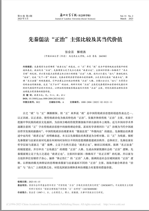 Beat365官网张会芸、解晓燕老师在《兰州大学学报(社会科学版)》2023年第2期上发表论文《先秦儒法“正治”主张比较及其当代价值》,该论文为张会芸所主持的国家社科基金青年项目“中国传统‘正治’方略及其现代转化研究”的阶段性成果。