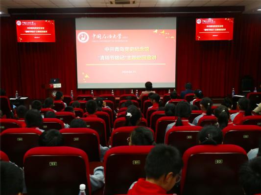 为深入贯彻落实习近平总书记“用好红色资源,讲好红色故事,搞好红色教育,让红色基因代代相传”的重要指示精神,推动党史学习教育常态化长效化,着力推动“大思政课”建设再上新台阶,4月17日,学院邀请中共青岛党史纪念馆“海岸星火”宣讲队走进校园,为石大学子带来“清明节铭记”主题巡回宣讲。活动由学院院长张瑞涛主持,青岛西海岸新区大中小学思政课教师代表和珠江路小学的学生代表也来到了宣讲现场,与石大师生同上一堂精彩的“大思政课”。