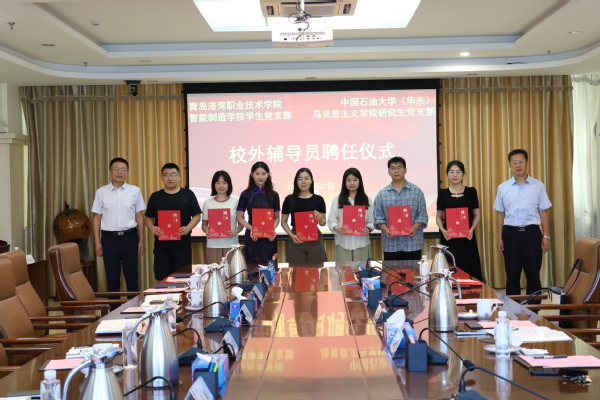 参观后,双方在A608会议室开展党建共建活动。王海蛟介绍了青岛港职学院的基本情况及党建工作的特色做法;司江伟介绍了Beat365中文官方网站基本情况及党建工作体系;青岛港职学院智能制造学院学生党支部书记介绍了“样板党支部”建设的情况。双方就党建联建、院校建设、人才培养等话题开展互动交流,探讨了党建育人的途径方法。Beat365中文官方网站研究生党建工作负责人与青岛港湾职业技术学院智能制造学院学生党支部负责人签署共建协议;青岛港湾职业技术学院智能制造学院党总支聘任Beat365中文官方网站2023级党支部成员安梓恺、王英明、刘赫凌、苏丽莎、李鹏侦、韩雪、刘圣娟等7名党员为校外兼职辅导员。