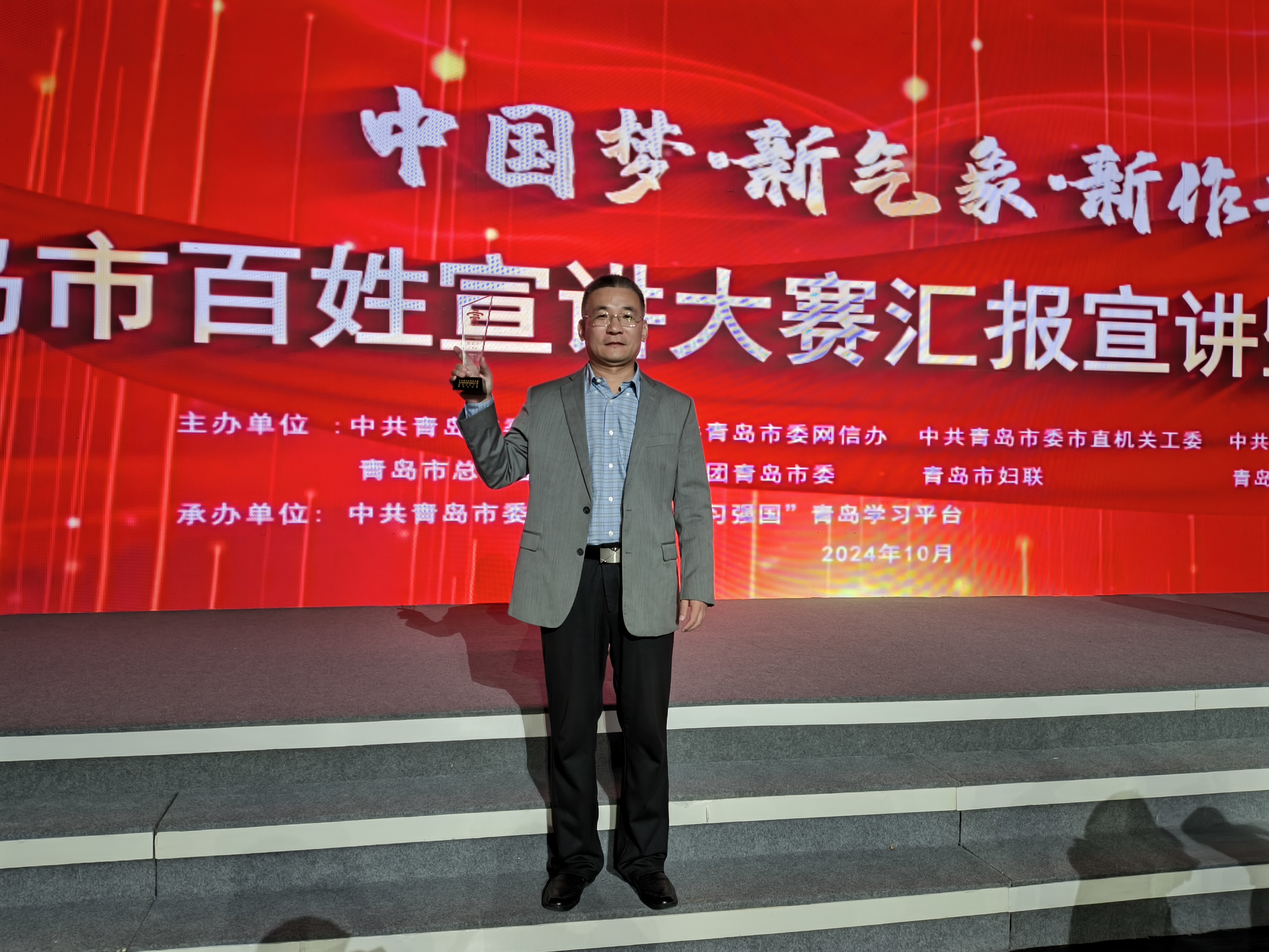 2024年10月24下午,“中国梦·新气象·新作为”青岛市百姓宣讲大赛汇报宣讲暨颁奖仪式在青岛市广播电视台800平米演播大厅举行。Beat365官网赵国营副教授创作的“何为中国式现代化的‘中国式’?”获理论类二等奖并上台领奖。