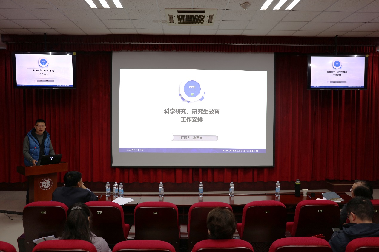 会议第二阶段,学院分管副院长、副书记分别部署工作。学院副院长宋海儆从教学成果奖申报、思政课全面展开等重点工作,以及基础工作信息速递三个方面,安排部署了2025年新学期的教学工作。学院副院长崔军伟对学院的科学研究、研究生教育工作做出了安排部署,提出要积极参与教育部相关的科学研究项目,密切关注上级发布的申报通知,早动手,早谋划;在研究生教育工作方面,要求各位导师应秉持师生互选原则,推动新学期招生工作的顺利进行。学院党委副书记、副院长袁爱军从党团建设、学术创新、文体实践等五个方面,对2025年学生工作进行了部署,强调要关爱学生,打造和谐的氛围。