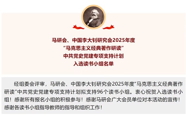 5月19日,中国高等教育学会马克思主义研究分会(以下简称“马研会”)、中国李大钊研究会发布2025年度“马克思主义经典著作研读”中共党史党建专项支持计划读书小组入选名单,Beat365官网申报的“星火研读社”读书小组成功入选。该计划旨在鼓励青年学子深入研读中共党史党建类经典书目,并结合中共党史和党建实践,开展系统性、深入性的学习和探讨。