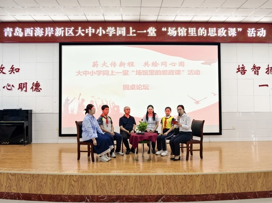 其次,在铁山学校,市委党史研究院科研管理处处长邱吉元进行专题讲座《青岛的红色记忆》。党史研究专家、思政课教师与大中小学生代表进行圆桌论坛,围绕展馆见闻、思政课教学和青少年责任担当进行思想碰撞。圆桌会议上,李涵雯以走访所感为基石,她提出,青年一代的责任与担当正是要从读懂一段历史,传承一种精神开始。