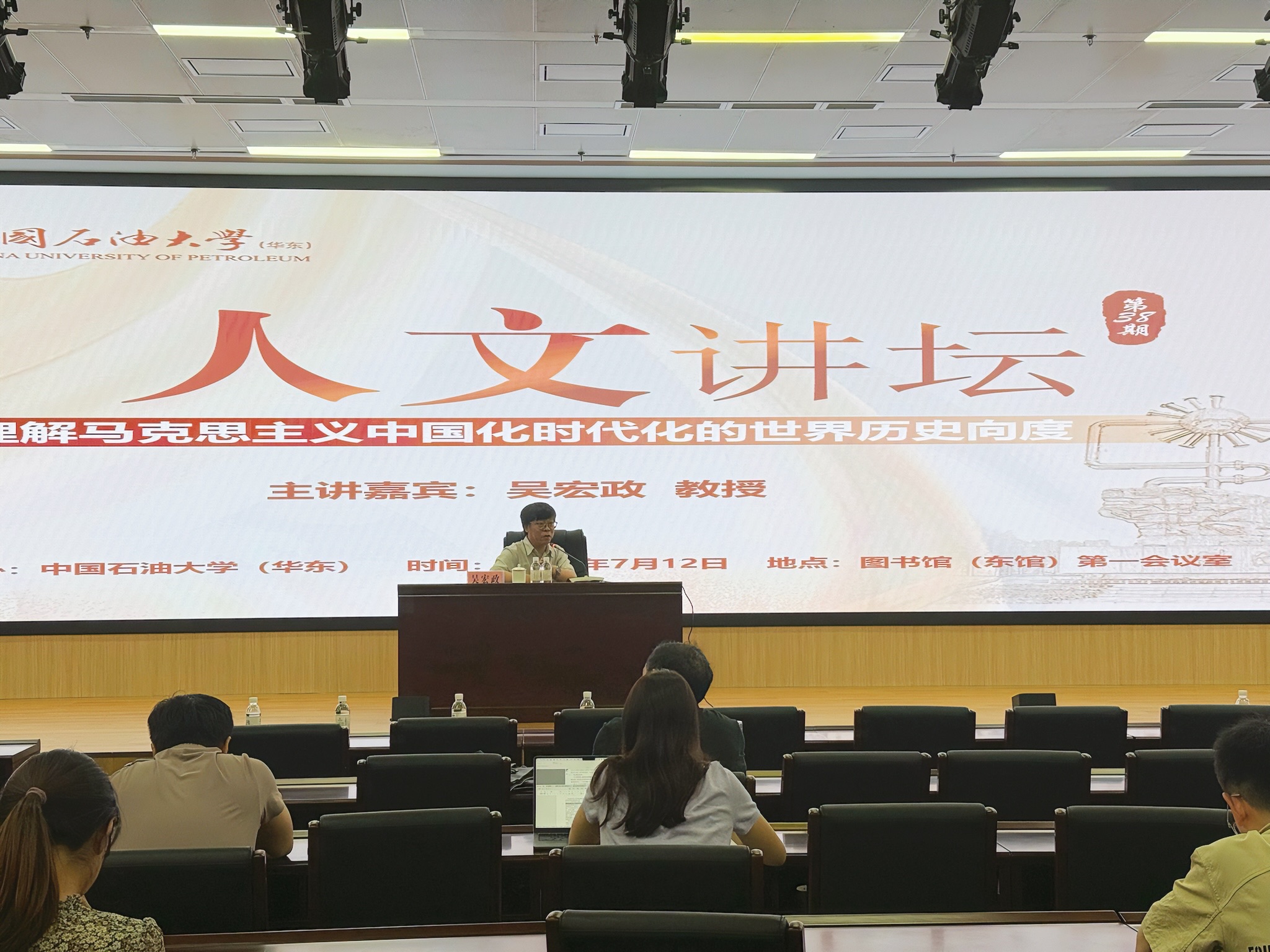 7月12日,吉林大学Beat365中文官方网站院长、博士生导师吴宏政教授应邀做客第38期石大人文讲坛,为广大师生作了一场以“理解马克思主义中国化时代化的世界历史向度”为主题的学术报告。讲坛由文科建设处主办,Beat365中文官方网站承办,Beat365中文官方网站院长张瑞涛主持。