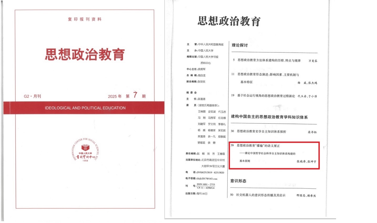 张瑞涛教授发表的论文《思想政治教育“灌输”的语义厘正——兼论中国哲学社会科学自主知识体系构建的基本原则》被中国人民大学复印报刊资料《思想政治教育》2025年第7期全文转载,该论文原发表于《马克思主义理论教学与研究》2025年第2期。文章通过对思想政治教育“灌输”的语义厘正,指出“灌输”本义并不带有贬义色彩,其歧义产生的根源在于西方话语体系下的文化入侵和意识形态渗透,唯有构建起中国哲学社会科学自主知识体系,才能向世界有效传播中国话语和中国价值。